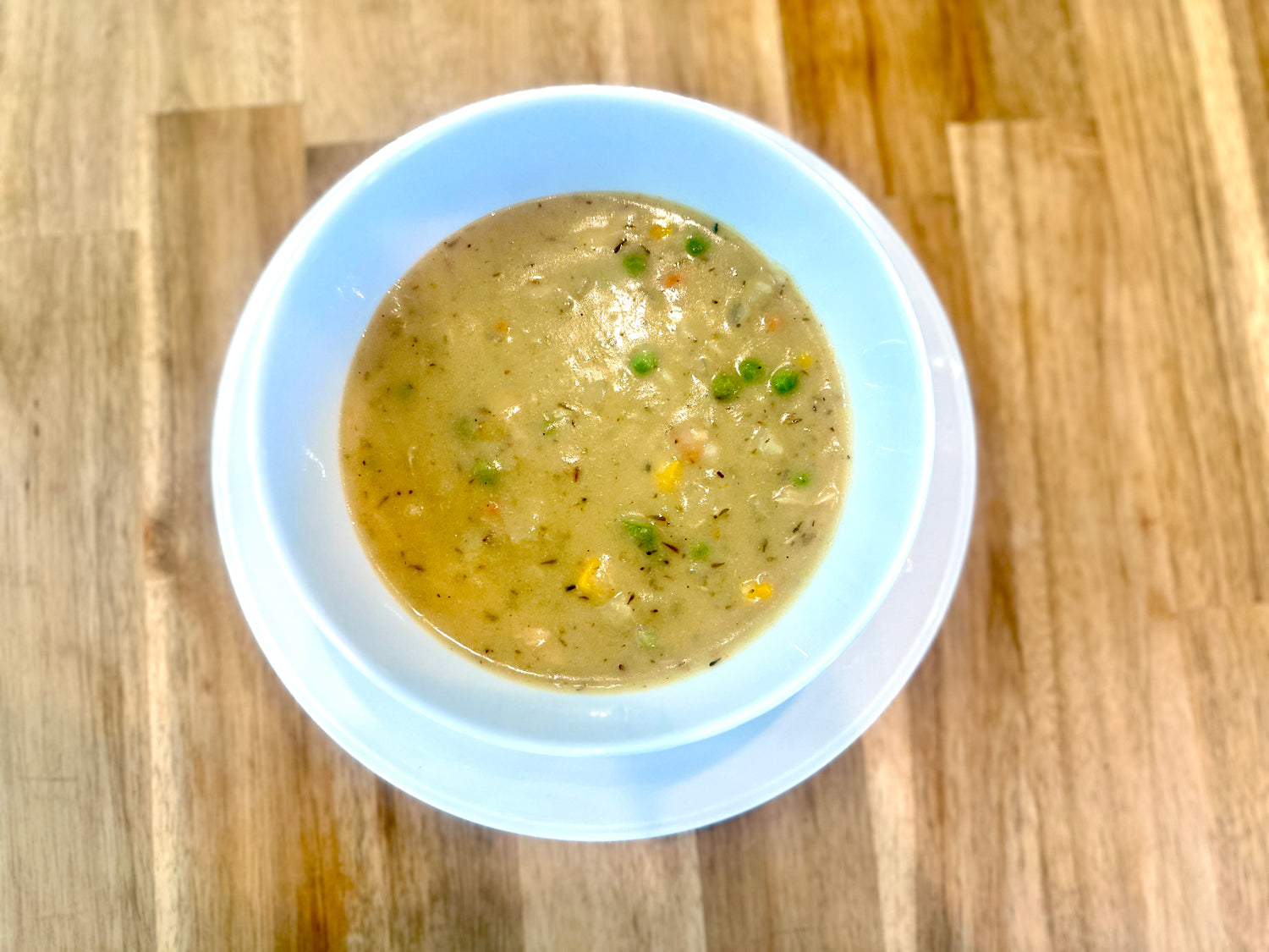Chicken, Potato, Cauliflower, Chicken Broth (Water, Chicken bones, Onion, Carrots, Celery, Garlic, Salt, Apple Cider Vinegar, Bay Leaf), Almond Milk (Water, Almonds), Peas, Corn, Carrot, Onion, Green Beans, Olive Oil, Thyme, Salt, Pepper. Allergens- Tree Nuts (Almonds)