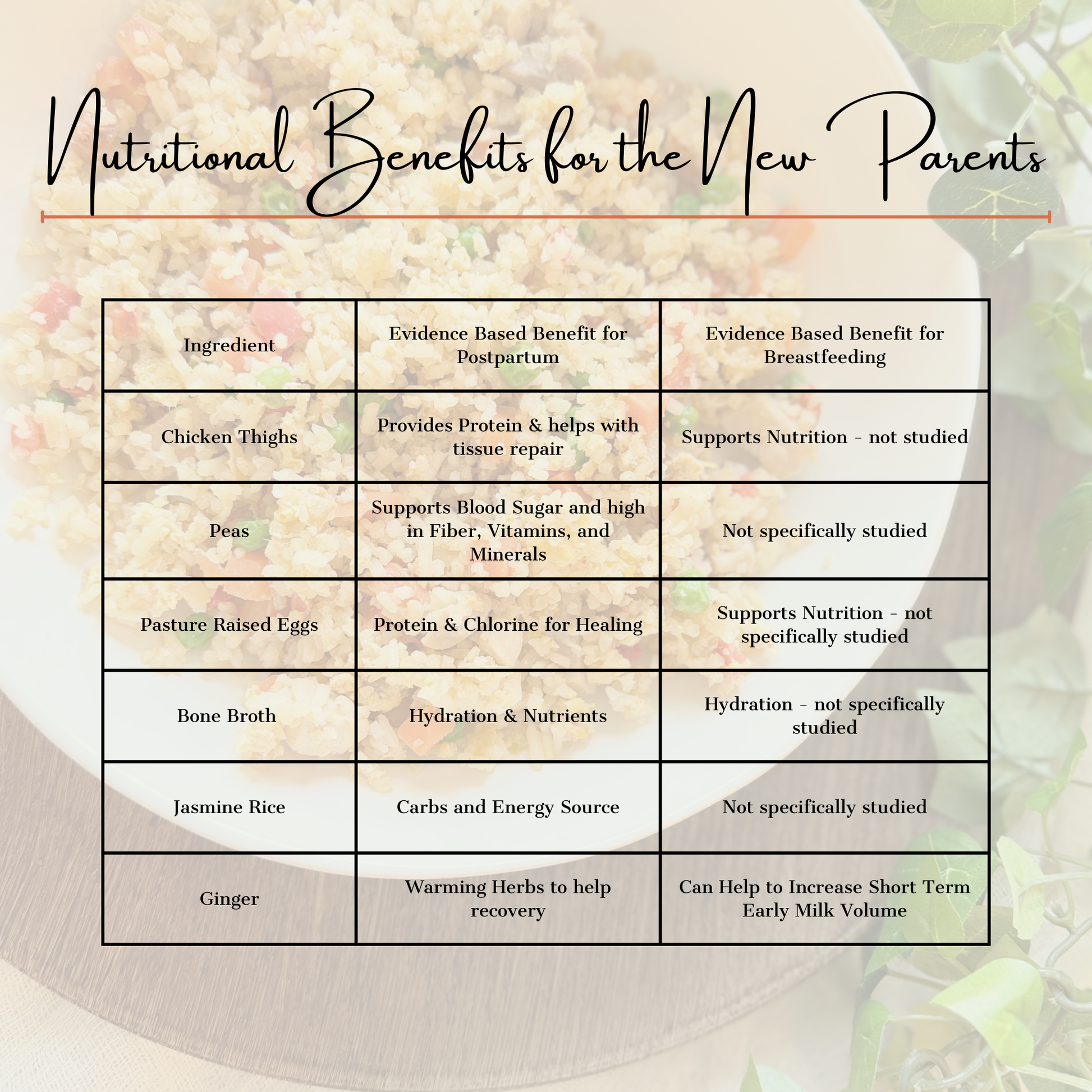 Chicken Thighs, Bone Broth (Water, Chicken bones, Onion, Carrots, Celery, Garlic, Salt, Apple Cider Vinegar, Bay Leaf),Jasmine Rice, Onion, Eggs, Peas, Carrots, Bell Pepper, Coconut Aminos, Rice Wine Vinegar, Olive Oil, Ginger, Sesame Oil, SaltĀ